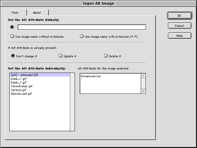 Set the Alt Attribute Individually: You can select an image of the document and change the Alt attribute for that image only. It has preference over the "Set the Alt attribute globally". The images are named following the next rules: First the extension search an "id" attribute for each image. If not present it search a "name" attribute and finally it just take the name of the image from "img src". In any case, if the alt attribute is present it adds an "[alt] - " prefix to see easily if any alt attribute is lost.